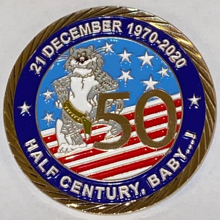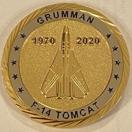 This is the front of the “TOMCAT 50th ANNIVERSARY” coin created by the Tomcat Association. It says “21 DECEMBER 1970 – 2020” across the top and “HALF CENTURY, BABY” along the bottom. The back of the coin is shown below. This is the back of the “TOMCAT 50th ANNIVERSARY” coin created by the Tomcat Association. It says “GRUMMAN” across the top and “F-14 TOMCAT” along the bottom. It has the dates “1970 – 2020” on either side of the nose of the jet, which is “raised” for that 3-D effect. The front of the coin is shown above (based on the official patch).