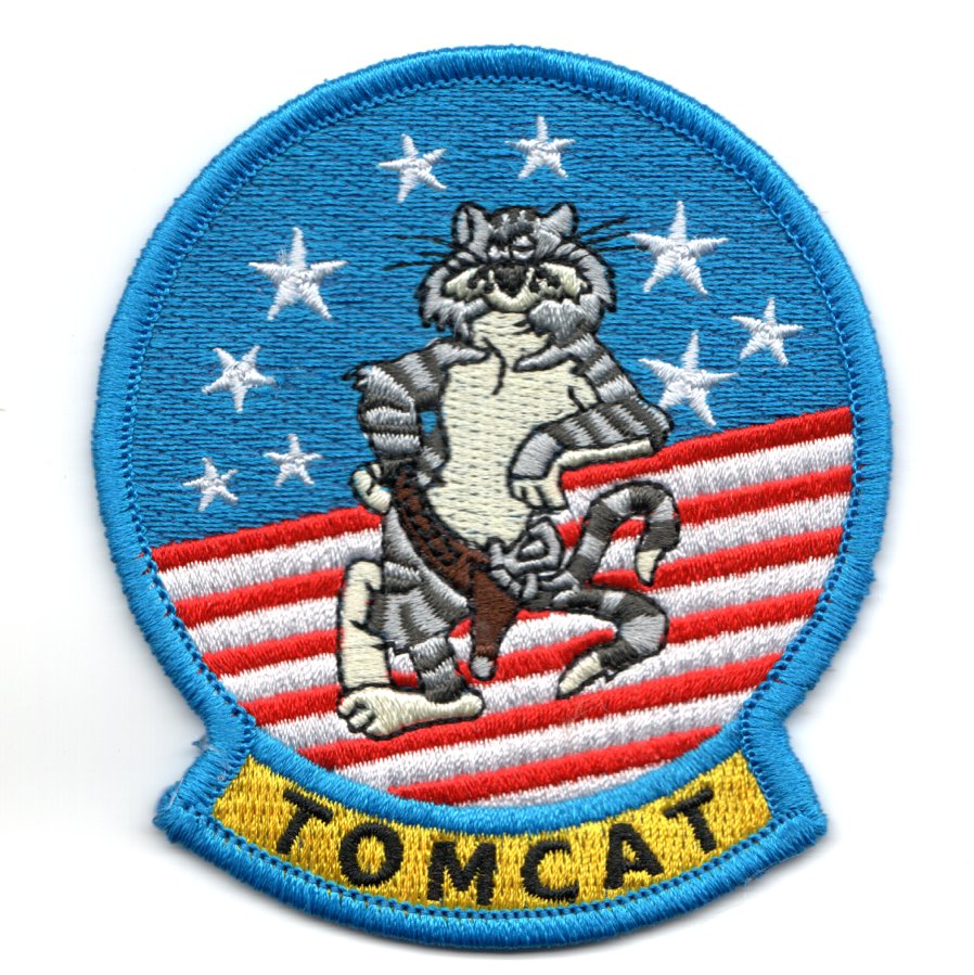 This is the light blue version of the F-14 Felix patch with the yellow tab at the bottom that says TOMCAT. It depicts the mascot leaning against the red/white stripes of the American Flag and does not come with velcro attached.