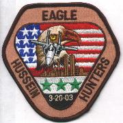 This is the desert version of the aircraft patch for the F-15 “Eagles”. It also has a date on it that denotes the first night of the OIF war. It says “Hussein Hunters” on it, and shows the F-15C flying over the twin towers. This patch does not come with velcro attached.
