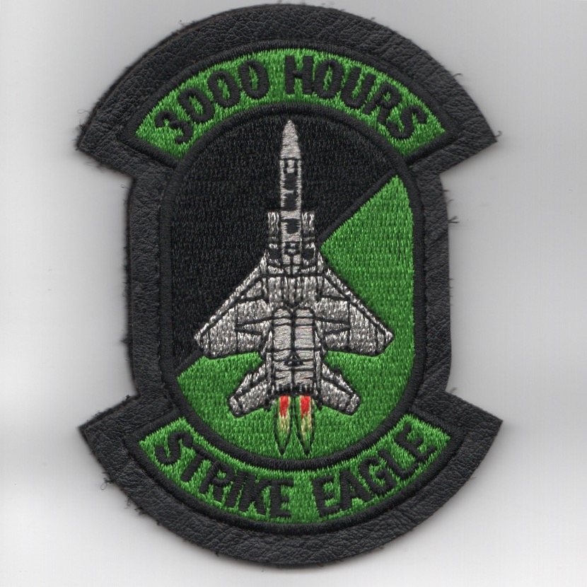 (Another AV8RSTUFF Creation): When I flew the mighty Strike Eagle (late ’90s), ‘QUIZMO’ and I worked on this design for several years to get it exactly right. As we ‘PCS’ed’ away, it fell to the wayside until last month when one of the squadrons asked us to complete the project. This is the “green” version of the LEATHER-bordered 3000 HOURS patch asked for and does come with velcro attached.