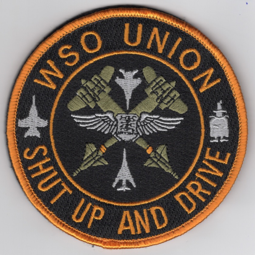 (AV8RSTUFF Creation): This is the orange-bordered version of the ‘WSO’ UNION / SHUT UP AND DRIVE patch for multiple platform back/side-seaters….THIS version has the F/A-18F, B-1B, F-15E aircraft and the F-4 SPOOK on the right and does NOT come with velcro attached.