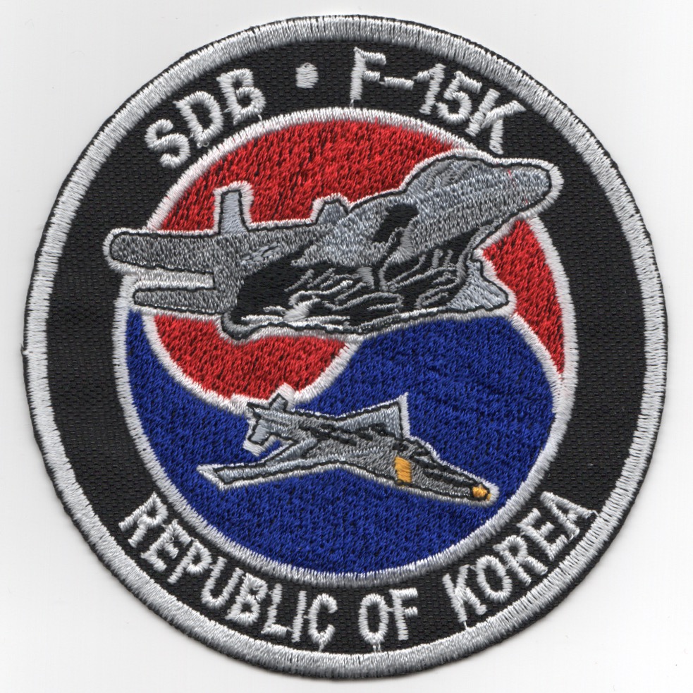 The F-15K variant has several features not typically found on F-15Es, such as an AAS-42 Infra-red search and track, a customized Tactical Electronics Warfare Suite to reduce weight and increase jamming effectiveness, cockpit compatibility with night vision devices, ARC-232 U/VHF radio with Fighter Data Link system, and advanced APG-63(V)1 mechanical-scanned array radar. The APG-63(V)1 radar has common digital processing equipment with the APG-63(V)3 AESA radar, and thus is upgradable to an AESA radar via antenna replacement. The F-15K is equipped with the Joint Helmet Mounted Cueing System and weapons such as AGM-84K SLAM-ER, AGM-84H Harpoon Block II, KEPD 350. This patch was found in a Korean embroidery shop, has the “theater-made” feel with the ‘cut’ edge, and does not have velcro attached!!