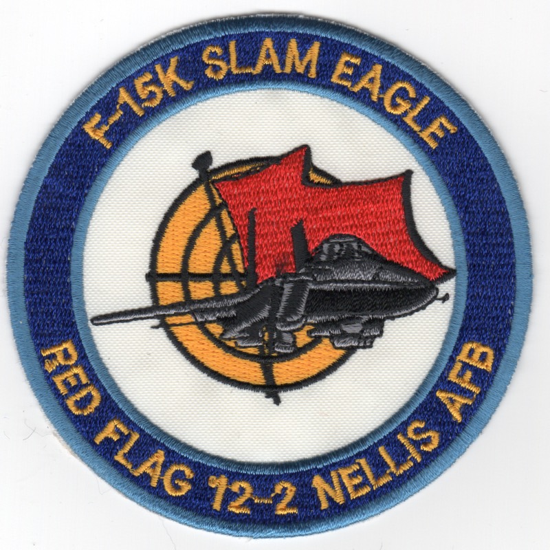 The F-15K variant has several features not typically found on F-15Es, such as an AAS-42 Infra-red search and track, a customized Tactical Electronics Warfare Suite to reduce weight and increase jamming effectiveness, cockpit compatibility with night vision devices, ARC-232 U/VHF radio with Fighter Data Link system, and advanced APG-63(V)1 mechanical-scanned array radar. The APG-63(V)1 radar has common digital processing equipment with the APG-63(V)3 AESA radar, and thus is upgradable to an AESA radar via antenna replacement. The F-15K is equipped with the Joint Helmet Mounted Cueing System and weapons such as AGM-84K SLAM-ER, AGM-84H Harpoon Block II, KEPD 350. This patch was created for the ROK unit that participated in the 2012 RED FLAG Exercise at Nellis AFB, NV. It says “F-15K SLAM EAGLE” (top), was found in a Korean embroidery shop, has the “theater-made” feel with the ‘cut’ edge, and does not have velcro attached.