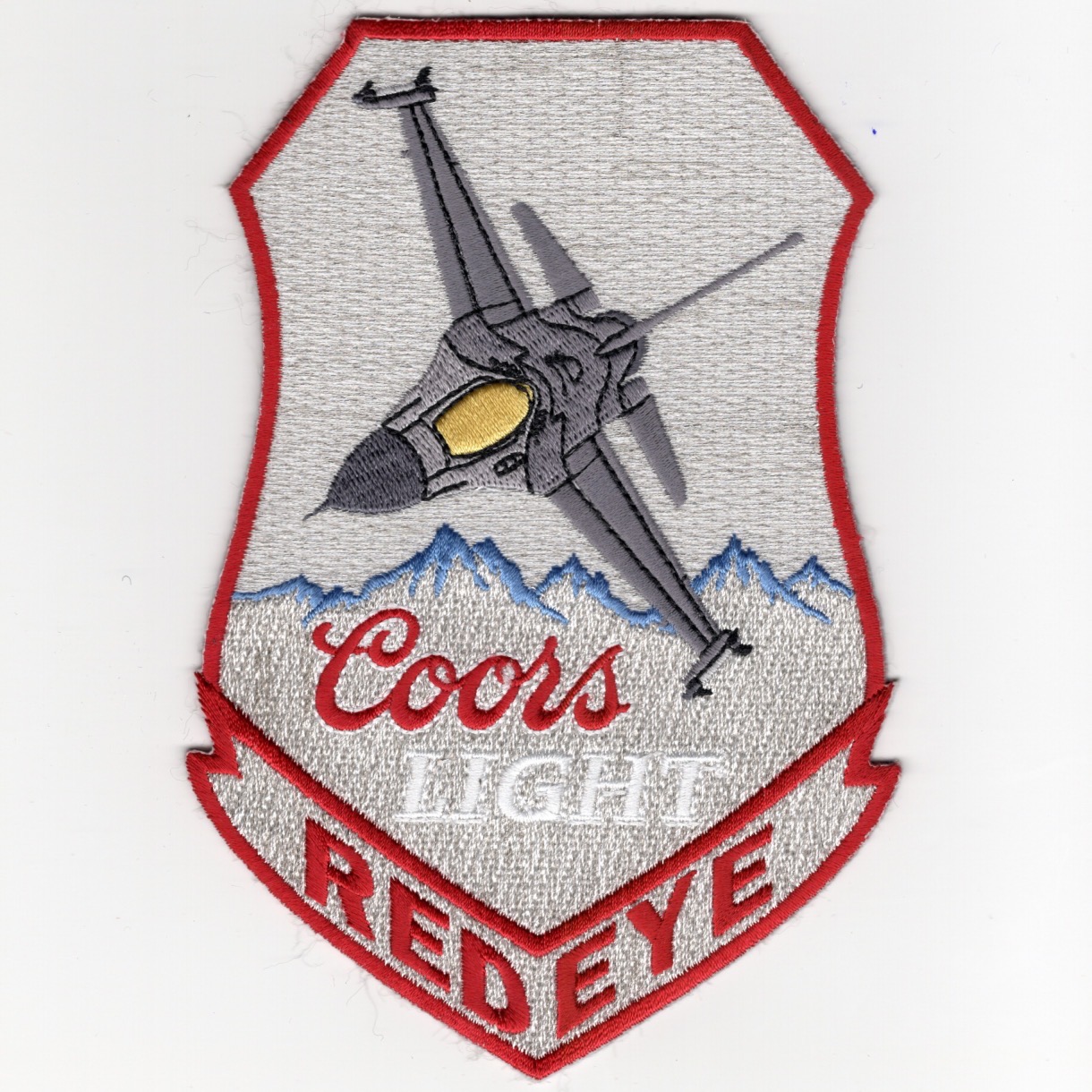 This is the large, SILVER version of the “REDEYE” patch for the 120FS, the Colorado Air National Guard unit that flies the F-16C+ out of Buckley AFB in Denver, CO. This version says “COORS LIGHT” under the F-16 and does not come with velcro attached.