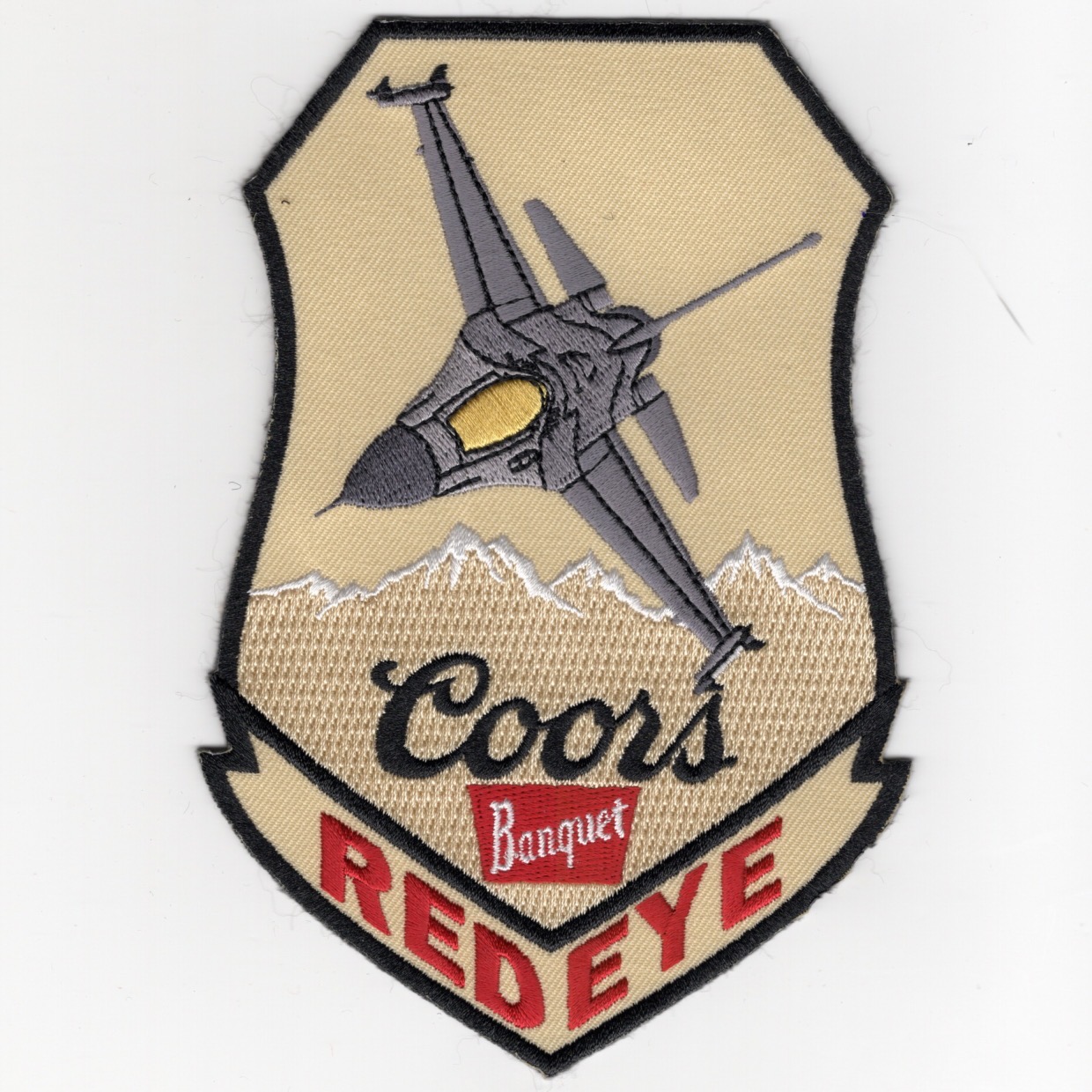 This is the large, DESERT TAN version of the “REDEYE” patch for the 120FS, the Colorado Air National Guard unit that flies the F-16C+ out of Buckley AFB in Denver, CO. This version says “COORS BANQUET” under the F-16 and does not come with velcro attached.