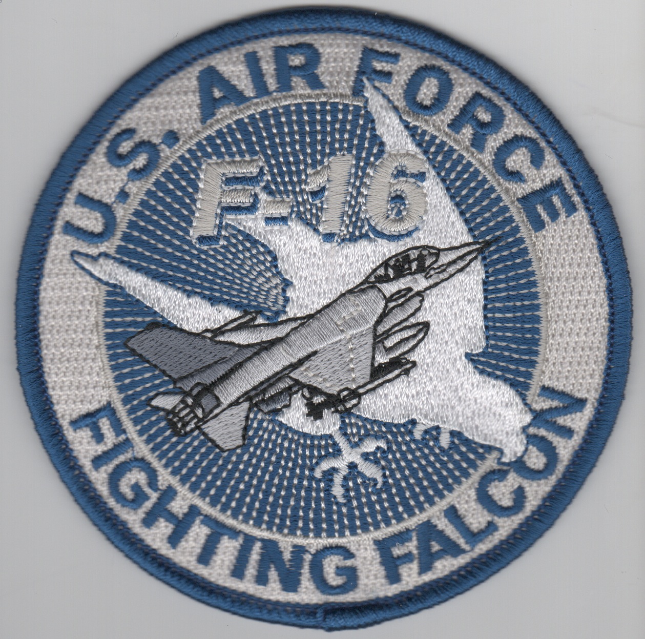This is the blue/silver colored version of the aircraft patch for the F-16 Fighting Falcons. This patch does not come with velcro attached.