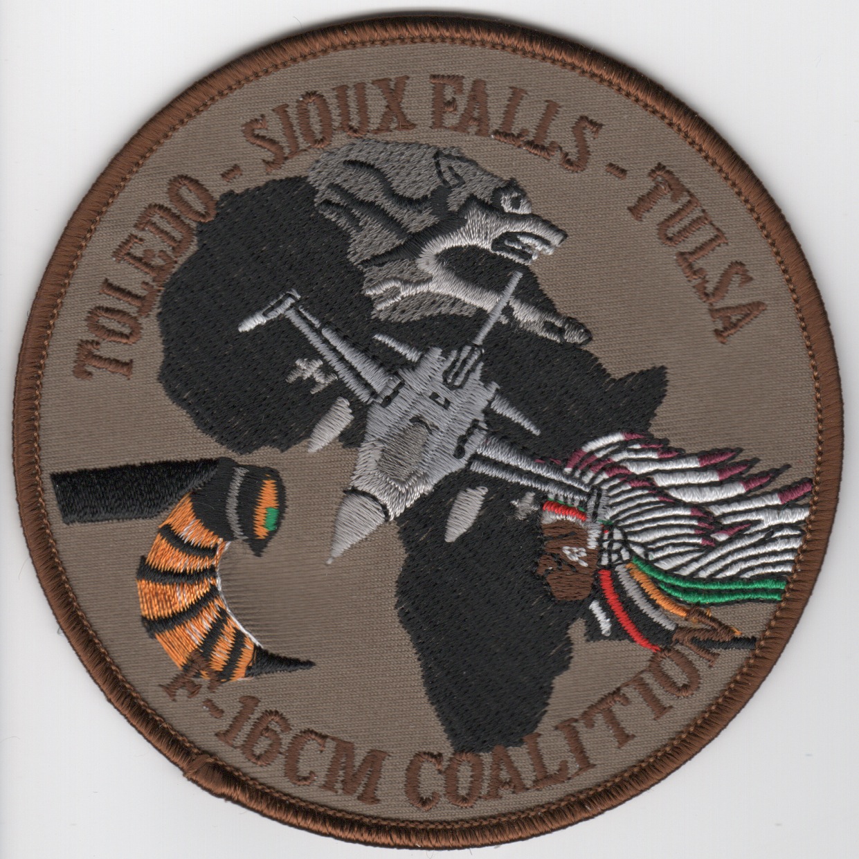 This is the desert version of the “Gaggle” patch for the Toledo, OH F-16 unit (112FS), the Sioux Falls F-16 unit (175FS), and the Tulsa, OK F-16 unit (125FS) that fly the F-16. This was their “Coalition” patch created for their “joint deployment”.