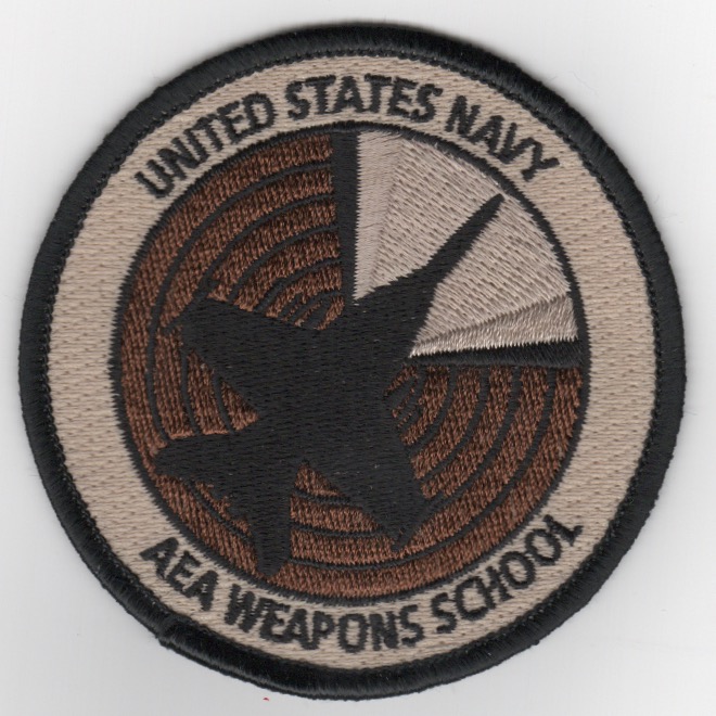 This is the desert version of the F/A-18 Hornet aircraft ‘bullet’ patch for the US Navy’s Airborne Electronic Attack (AEA) Weapons School. It depicts the Hornet radar emanating in front, searching for targets. This patch does not come with velcro attached.