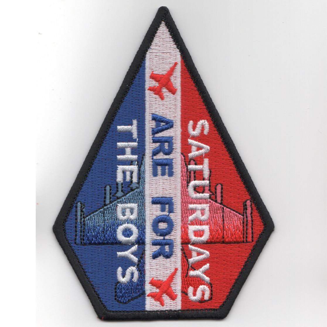 This is the F-18 ‘Coffin’ patch that says “SATURDAYS ARE FOR THE BOYS”. Not really sure the story behind this design, but does have the Hornet planform woven into the Red/White/Blue color scheme. This patch does not have velcro.