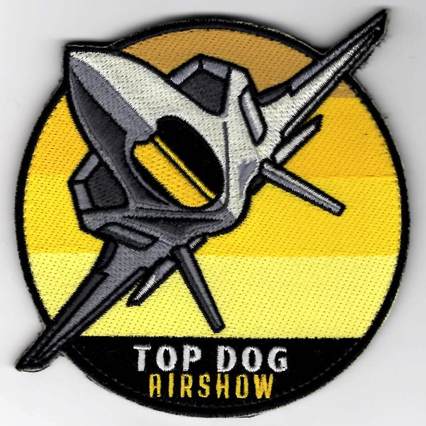 This is the F-22 *TOP DOG AIRSHOW* patch created by the F-22 community showing the Raptor inverted on a yellow background. This patch DOES come with velcro attached. .