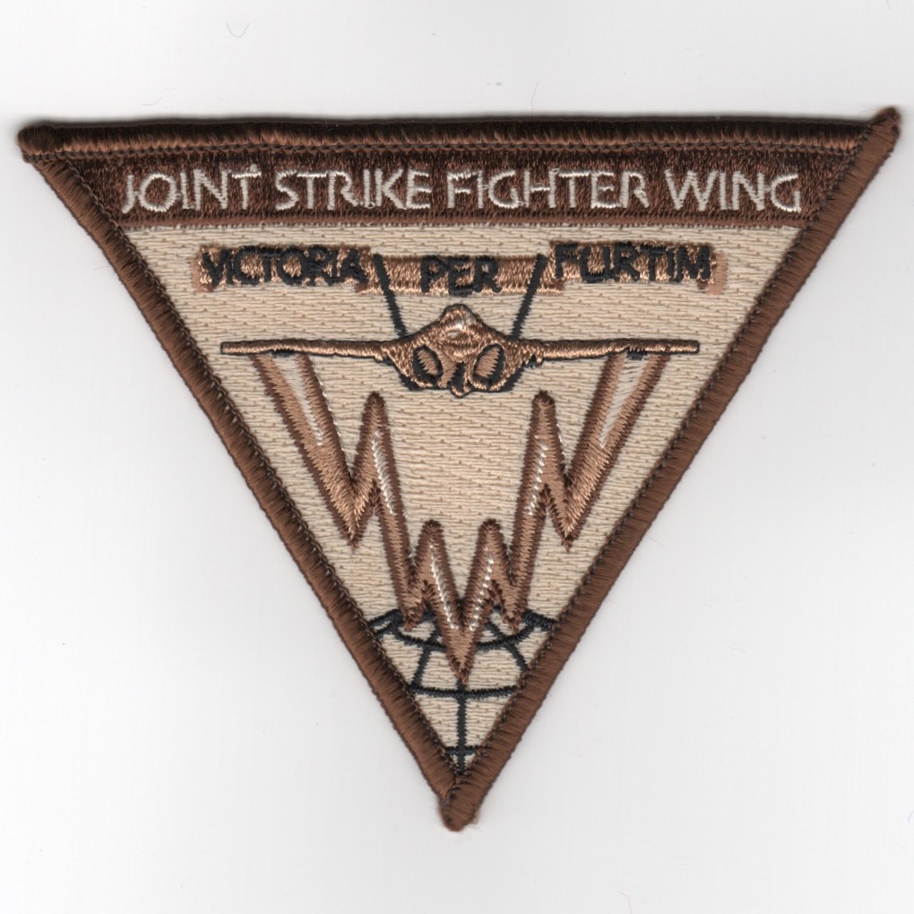 The Lockheed Martin F-35 Lightning II is a family of single-seat, single-engined, all-weather stealth multirole fighters. The fifth-generation combat aircraft is designed to perform ground-attack and air- superiority missions. It has three main models: the F-35A conventional takeoff and landing (CTOL) variant, the F-35B short take-off and vertical-landing (STOVL) variant, and the F-35C carrier-based catapult-assisted take-off but arrested recovery (CATOBAR) variant. In July 2015, the United States Marines declared ready for deployment the first squadron of F-35B fighters after intensive testing, and in August 2016, the U.S. Air Force declared its first squadron of F-35A fighters combat-ready. The F-35 descends from the X-35, the winning design of the Joint Strike Fighter (JSF) program. An aerospace industry team led by Lockheed Martin designed and manufactures it. Other major F-35 industry partners include Northrop Grumman, Pratt & Whitney, and BAE Systems. The F-35 first flew on 15 December 2006. The United States plans to buy 2,663 aircraft. Its variants are to provide the bulk of the crewed tactical airpower of the U.S. Air Force, Navy, and Marine Corps over the coming decades. Deliveries of the F-35 or the U.S. military are scheduled until 2037 with a projected service life up to 2070. This is the desert triangular version of the patch created for the “JOINT” wing and does not come with velcro attached.