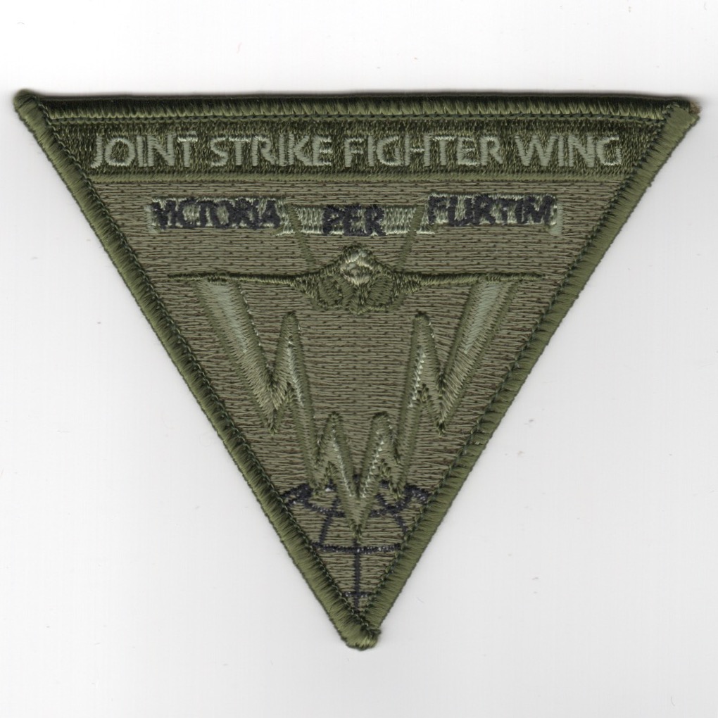 The Lockheed Martin F-35 Lightning II is a family of single-seat, single-engined, all-weather stealth multirole fighters. The fifth-generation combat aircraft is designed to perform ground-attack and air- superiority missions. It has three main models: the F-35A conventional takeoff and landing (CTOL) variant, the F-35B short take-off and vertical-landing (STOVL) variant, and the F-35C carrier-based catapult-assisted take-off but arrested recovery (CATOBAR) variant. In July 2015, the United States Marines declared ready for deployment the first squadron of F-35B fighters after intensive testing, and in August 2016, the U.S. Air Force declared its first squadron of F-35A fighters combat-ready. The F-35 descends from the X-35, the winning design of the Joint Strike Fighter (JSF) program. An aerospace industry team led by Lockheed Martin designed and manufactures it. Other major F-35 industry partners include Northrop Grumman, Pratt & Whitney, and BAE Systems. The F-35 first flew on 15 December 2006. The United States plans to buy 2,663 aircraft. Its variants are to provide the bulk of the crewed tactical airpower of the U.S. Air Force, Navy, and Marine Corps over the coming decades. Deliveries of the F-35 or the U.S. military are scheduled until 2037 with a projected service life up to 2070. This is the OCP green triangular version of the patch created for the “JOINT” wing and does not come with velcro attached.