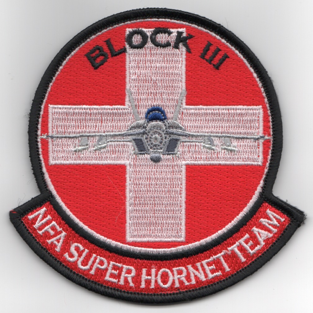 (Another AV8RSTUFF Creation): This is the “”””test team”””” patch created for the NFA SUPER HORNET Team that took the F/A-18 BLOCK III aircraft over to Switzerland to demo/promo it in hopes they want to buy it. We made nametags for them also (below) and this patch does have velcro attached.