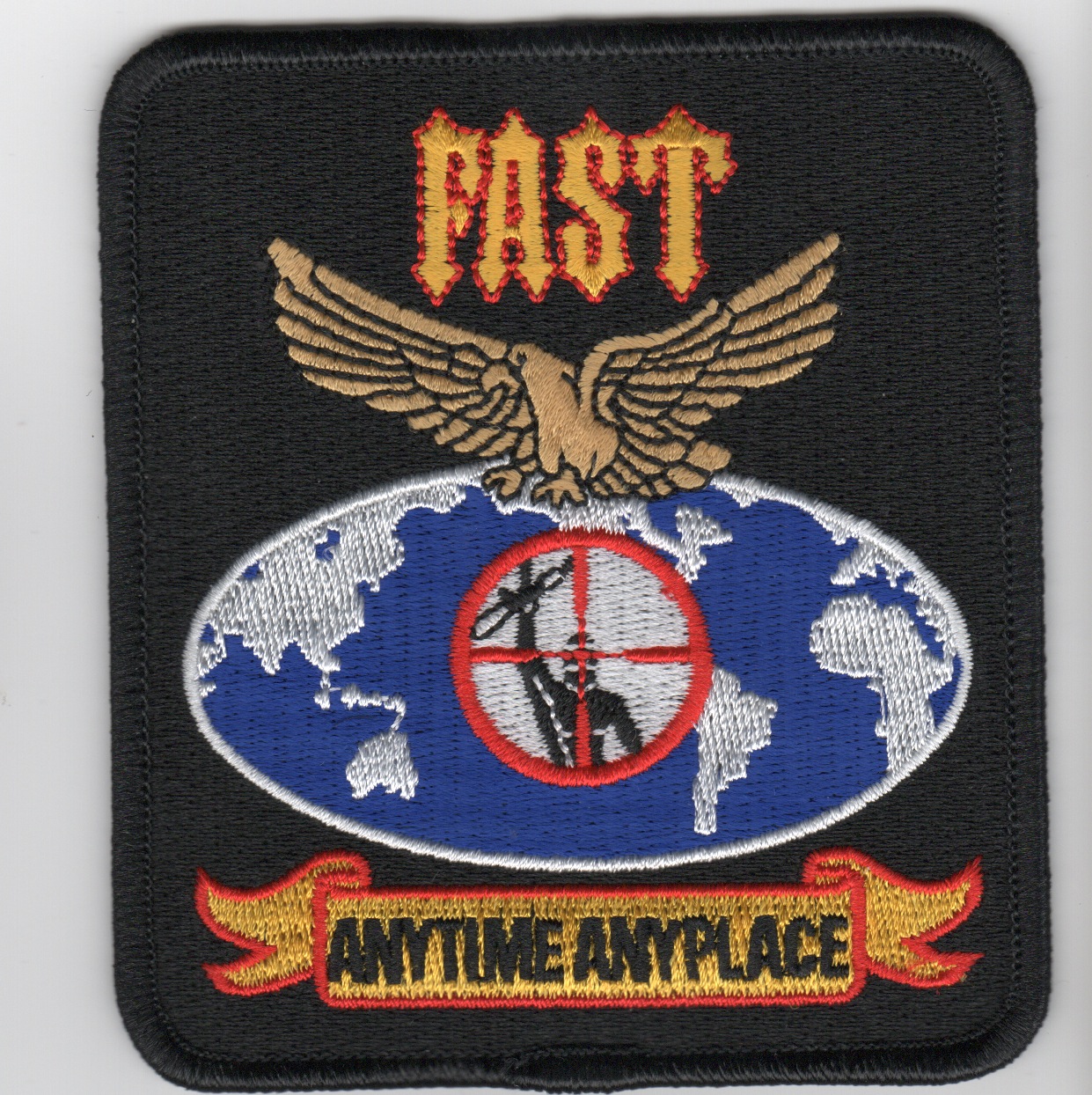 This is the rectangular version of the US Marine Corps F.A.S.T. patch and says “Anytime, Anyplace”. “F.A.S.T.” stands for Fleet Anti-Terrorism Security Team.