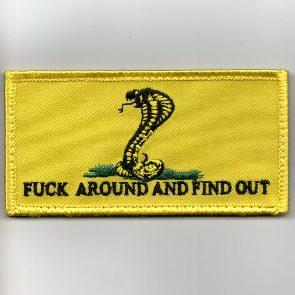This is the yellow version of the famous “Don’t Tread on Me” flag with the lettering along the bottom changed to read “FUCK AROUND AND FIND OUT”. This patch does come with velcro attached.