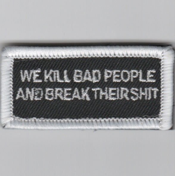 The black version of this patch says, “We Kill Bad People And Break Their Shit” — True. This patch comes with velcro already attached.