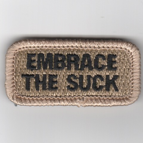 This is the desert version with black letters of the FSS patch that says “”””Embrace the Suck””””. This patch DOES NOT comeswith velcro attached.