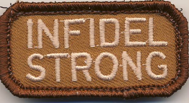 This is the Flight Suit Sleeve Infidel Strong patch. I’m pretty sure it’s a play on the Army slogan, “Army Strong”. It comes in desert colors. This patch comes with velcro attached.