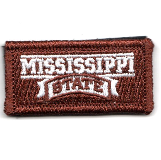 This is the DARK MAROON version of the Flight Suit Sleeve (FSS) Patch for Mississippi State University. We were asked to make this for their students / ROTC members. This version shows the entire spelling of the University’s name and is their “”””legacy”””” logo (when I was in school there). This patch DOES have velcro attached.
