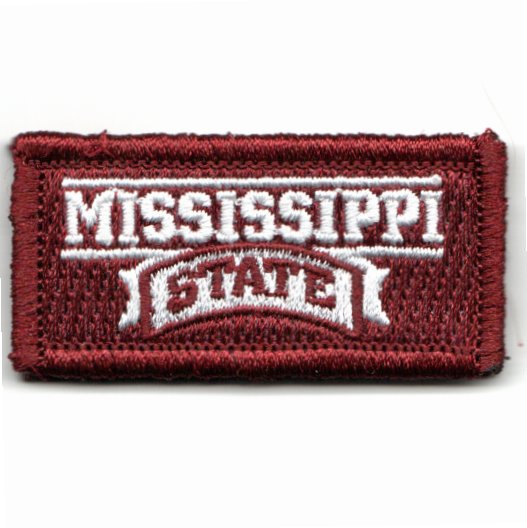 This is the “”””regular”””” maroon version of the Flight Suit Sleeve (FSS) Patch for Mississippi State University. We were asked to make this for their students / ROTC members. This version shows the entire spelling of the University’s name and is their “”””legacy”””” logo (when I was in school there). This patch DOES have velcro attached.