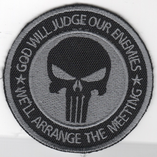 This is the “Chris Kyle” patch that says “GOD WILL JUDGE OUR ENEMIES” (top) and “WE’LL ARRANGE THE MEETING” (bottom). This patch was found in a Korean embroidery shop, has that “theater-made” feel to it with the ‘cut-edge’, and does not come with velcro.
