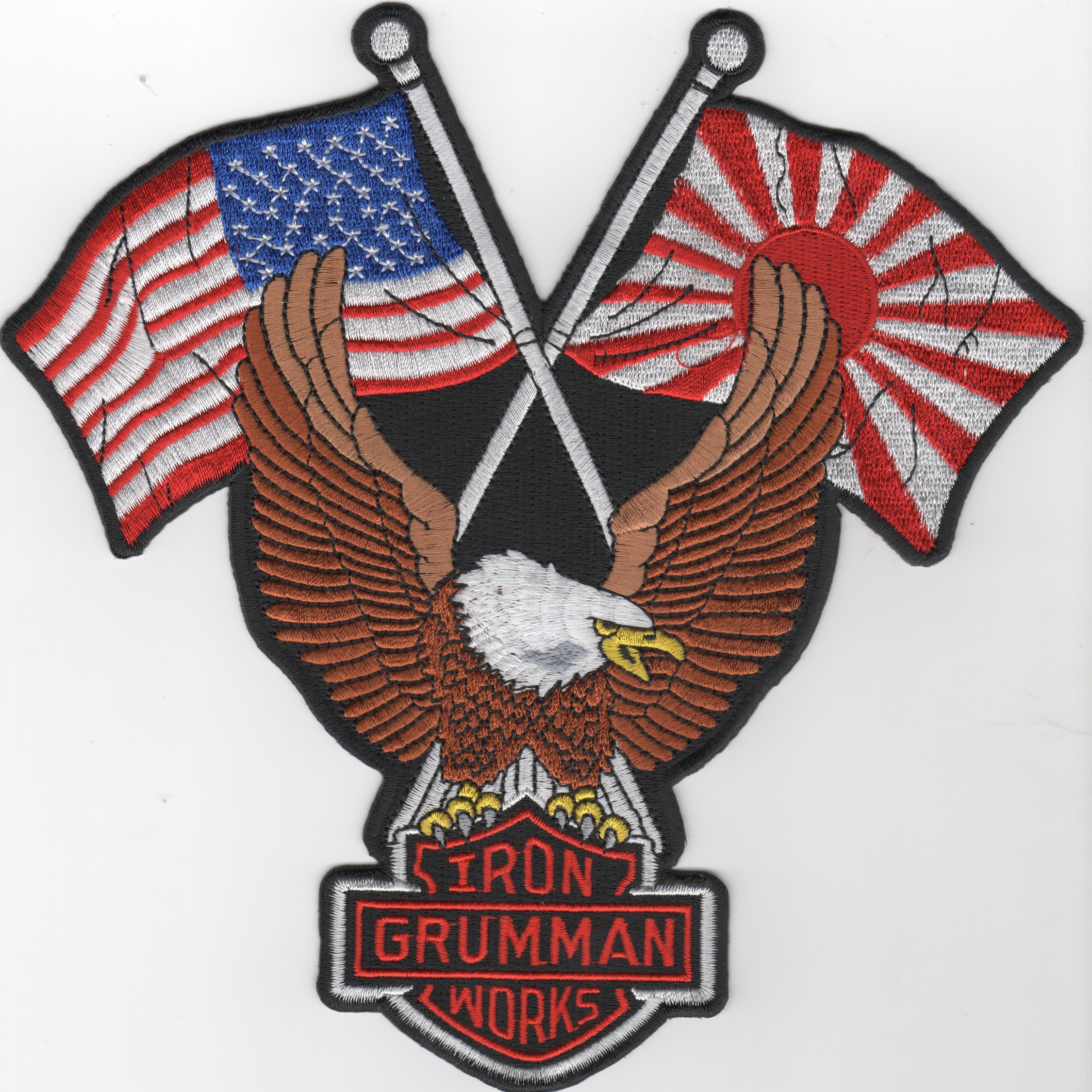 For many years, US Naval Aviation was known as the “Grumman Navy” due to the large percentage of aircraft that were produced by the Grumman Ironworks. These aircraft consisted of the A-6E Intruder, EA-6B Prowler, F-14 Tomcat, the E-2C Hawkeye, and the C-2 Greyhound. This is the EXTRA LARGE version of the famous Grumman patch depicting the American and Japanese flags in the background.