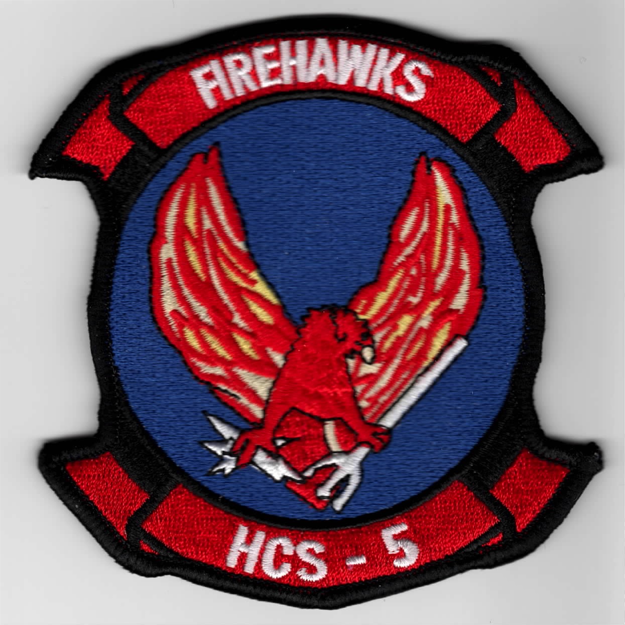 Helicopter Attack Squadron (Light) Five, known by the US Navy designation HA(L)-5 (sometimes stylized as HAL-5), was the initial designation of a Naval Special Warfare and close air support helicopter squadron in the period following the Vietnam War, which, along with its sister squadron HA(L)-4 “Red Wolves”, was one of the last two US Navy squadrons using HH-1K “Huey” gunships. In October 1989 the squadron was redesignated Helicopter Combat Support Squadron Special Five (HCS-5), it adopted the name “Firehawks” and it traded in its “Hueys” for HH-60H Seahawk Combat Search and Rescue helicopters. The squadron was deactivated on 13 December 2006. This is the red-blue version of the squadron patch and does not have velcro attached.