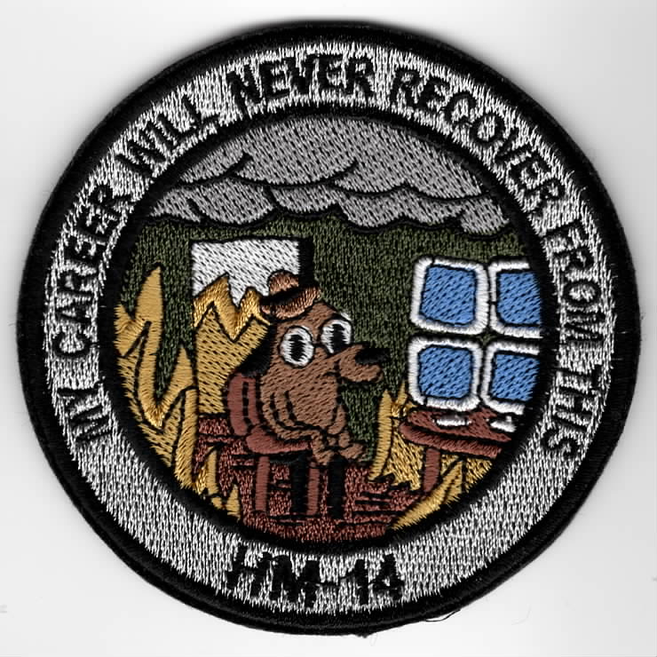 This is one of the “det” patch for HM-14, just picked up from one of their ‘KOREAN’ suppliers. It says “MY CAREER WILL NEVER RECOVER FROM THIS” (top), HM-14 (bottom), and shows a dog “cartoon character” watching the DUTY DESK with flames all around!! This patch does not have velcro.