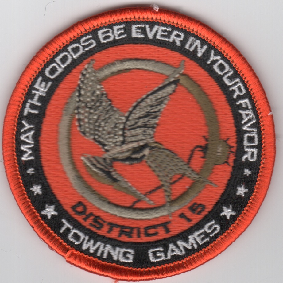 This is HM-15 DET-2 “MAY THE ODDS BE EVER IN YOUR FAVOR” patch showing the logo from “DISTRICT 15” logo(?) and says “TOWING GAMES” at the bottom. This one was also made for HM-15, a Navy MH-53E Airborne Mine Countermeasures squadron (hence “District 15”, “53” and “Towing” in the patch) Êbased out of Norfolk, VA and also a forward deployed DET in Bahrain.