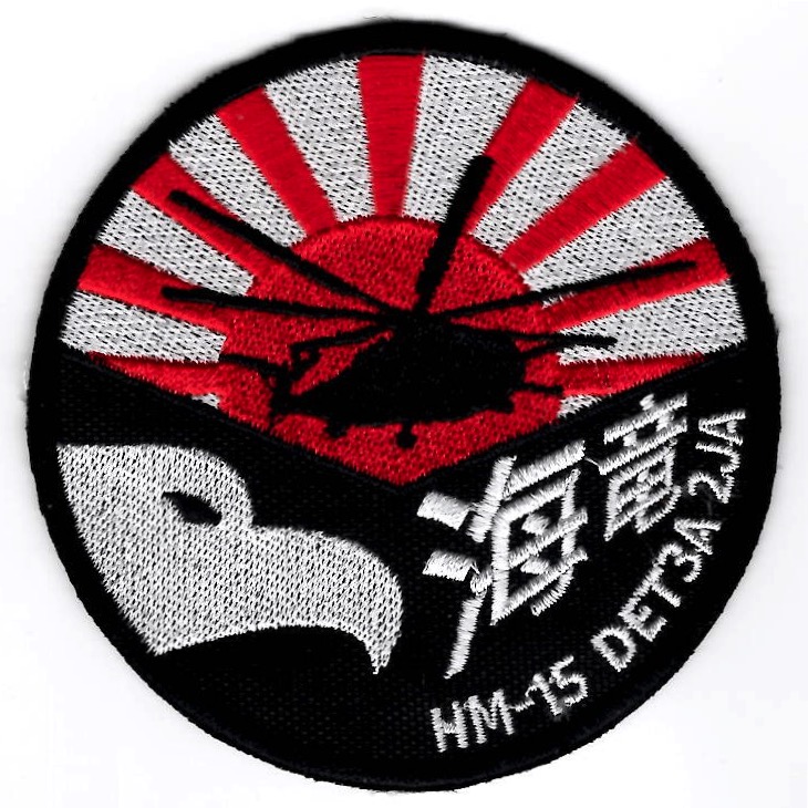 Helicopter Mine Countermeasures Squadron 15 (HM-15) is a USN helicopter squadron established in 1987 and based at NAS Norfolk, VA. Nicknamed the “Blackhawks” and flying the MH-53E Sea Dragon, it is staffed by both active duty and reserve personnel. It is the sister squadron to HM-14, the “Vanguard”, based a half-mile away at NAS Norfolk, VA. This is the ‘DET3A 2JA’ version of their deployed patch by one of their ‘Korean’ suppliers, has the red/white “SUN RAYS”, and does not come with velcro attached.