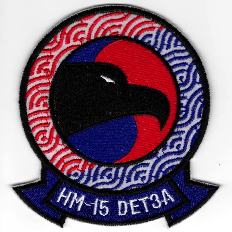 Helicopter Mine Countermeasures Squadron 15 (HM-15) is a USN helicopter squadron established in 1987 and based at NAS Norfolk, VA. Nicknamed the “Blackhawks” and flying the MH-53E Sea Dragon, it is staffed by both active duty and reserve personnel. It is the sister squadron to HM-14, the “Vanguard”, based a half-mile away at NAS Norfolk, VA. This is the ‘DET3A’ version of their squadron patch by one of their ‘Korean’ suppliers, has the red/blue “swirls” around the Hawk, and does not come with velcro attached.