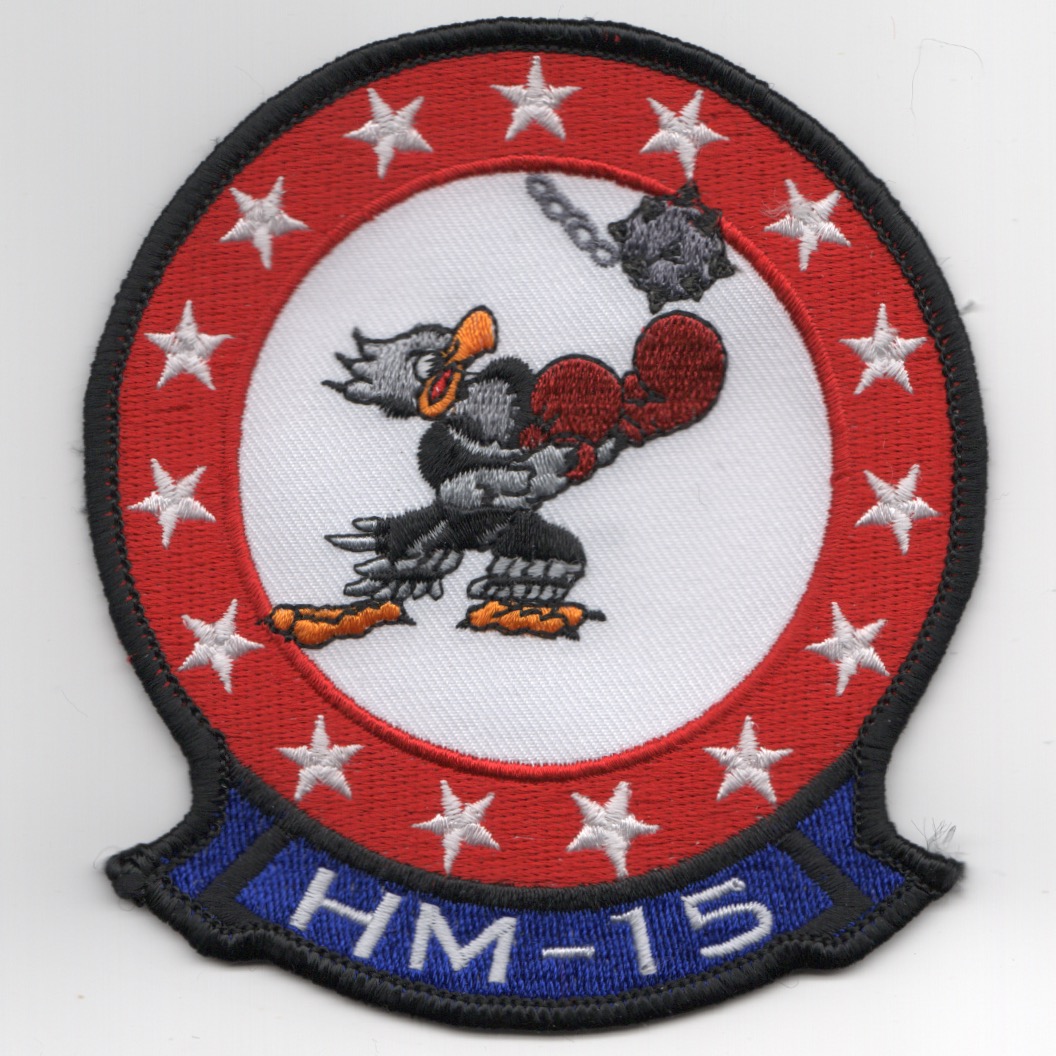 Helicopter Mine Countermeasures Squadron 15 (HM-15) is a United States Navy helicopter squadron established in 1987 and based at Naval Station Norfolk, Virginia. Nicknamed the “Blackhawks” and flying the MH-53E Sea Dragon, it is staffed by both active duty and reserve personnel. It is the sister squadron to HM-14, the “Vanguard”, based a half-mile away at Naval Station Norfolk, VA. This is the ‘FIGHTING HAWKS’ version of their squadron patch with the blue ‘tab’ (bottom) and does not come with velcro attached.
