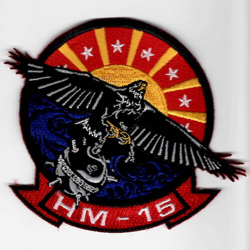 Helicopter Mine Countermeasures Squadron 15 (HM-15) is a US Navy helicopter squadron established in 1987 and based at NS Norfolk, VA. Nicknamed the “Blackhawks” and flying the MH-53E Sea Dragon, it is staffed by both active duty and reserve personnel. It is the sister squadron to HM-14, the “Vanguard”, based a half-mile away also at NS Norfolk, VA. This patch shows the BLACKHAWK (their mascot) carrying a MK-50 Series(?) in it’s talons and does not come with velcro attached.