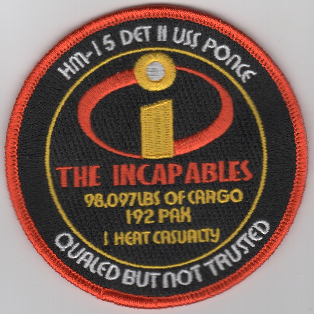 Helicopter Mine Countermeasures Squadron 15 (HM-15) is a United States Navy helicopter squadron established in 1987 and based at Naval Station Norfolk, Virginia. Nicknamed the “Blackhawks” and flying the MH-53E Sea Dragon, it is staffed by both active duty and reserve personnel. It is the sister squadron to HM-14, the “Vanguard”, based a half-mile away at Naval Station Norfolk, VA. This is their detachment patch created for Det-2 on the USS PONCE. It says “QUAL’ED BUT NOT TRUSTED” at the bottom.