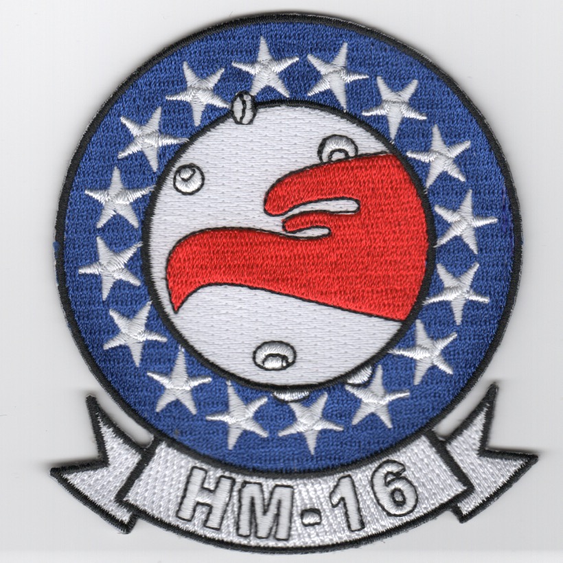 This is the squadron patch for the HM-16 Seahawks. They were established on September 20, 1974 and flew the Sikorsky RH-53D Sea Stallion until they were decommissioned on January 2, 1987. This patch does not come with velcro attached.