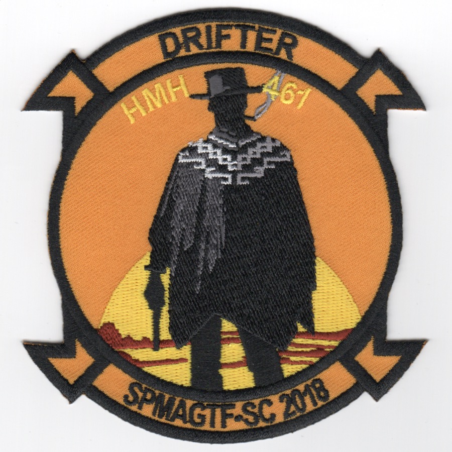 Marine Heavy Helicopter Squadron 461 (HMH-461) is a United States Marine Corps helicopter squadron consisting of CH-53E Super Stallion transport helicopters. The squadron, known as “Ironhorse”, is based at Marine Corps Air Station New River, North Carolina and falls under the command of Marine Aircraft Group 29 (MAG-29) and the 2nd Marine Aircraft Wing (2nd MAW). This is the DET patch created for HMH-461 2018 SPMAGTF-SC ‘DRIFTER’ detachment. It shows the (in my opinion) ‘Outlaw Josey Wales’. This patch does not have velcro attached.