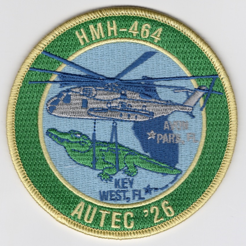 This is the green-yellow version of the *KEY WEST DET* patch for the HMH-464 ‘Condors’ out of MCAS New River, NC. They operate under the watchful eyes of MAG-29 and fly the Sikorsky CH-53E Super Stallion transport helicopter in support of US Ground Forces. This patch shows the MH-53E carrying an alligator over the state of Florida and does not come with velcro attached.