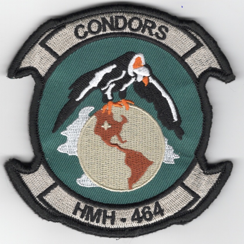 Marine Heavy Helicopter Squadron 464 (HMH-464) is a US Marine Corps helicopter squadron consisting of CH-53E Super Stallion transport helicopters. The squadron is known as the “Condors” and is based at MCAS New River, NC. They fall under the command of Marine Aircraft Group 29 (MAG-29) and the 2nd Marine Aircraft Wing (2nd MAW). This is the “2-tab, green-twill background” version of the squadron patch for the HMH-464 ‘Condors’ and does come with velcro attached.