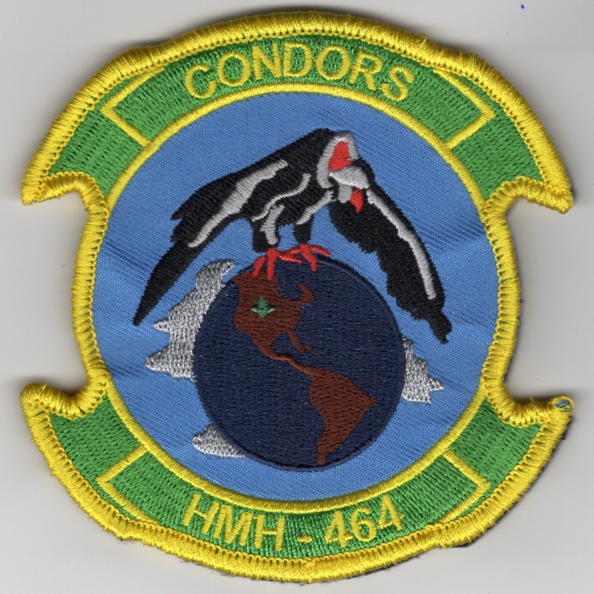 Marine Heavy Helicopter Squadron 464 (HMH-464) is a US Marine Corps helicopter squadron consisting of CH-53E Super Stallion transport helicopters. The squadron is known as the “Condors” and is based at MCAS New River, NC. They fall under the command of Marine Aircraft Group 29 (MAG-29) and the 2nd Marine Aircraft Wing (2nd MAW). This is the “2-tab, yellow-bordered” version of the squadron patch for the HMH-464 ‘Condors’ showing the “Condor” sitting on the world, and does come with velcro attached.