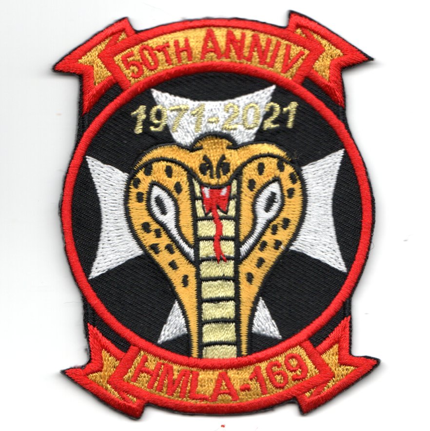 This is the small version of the 50th Anniversary patch for HMLA-169. They are attached to MAG-39 located at MCAS Camp Pendleton. They are a “long time” West coast “Float Squadron” doing multiple deployments. They were activated 30 September 1971 as HMA-169, then redesignated HMLA-169, 1 October 1986. They are a very decorated unit, with operations from Desert Shield/Desert Storm to Operation Sea Angel, Bangladesh, May 1991. This patch has the dates 1971 – 20212 (gold thread) at the top and does not come with velcro attached.