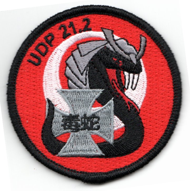 This patch was created for HMLA-169 and says “UDP 21.2” (at top) which stands for “Unit Deployment Program”. It shows the ‘cobra’ wearing a gray Samurai helmet, is holding the gray Maltese cross with Japanese script. This patch does not have velcro attached.
