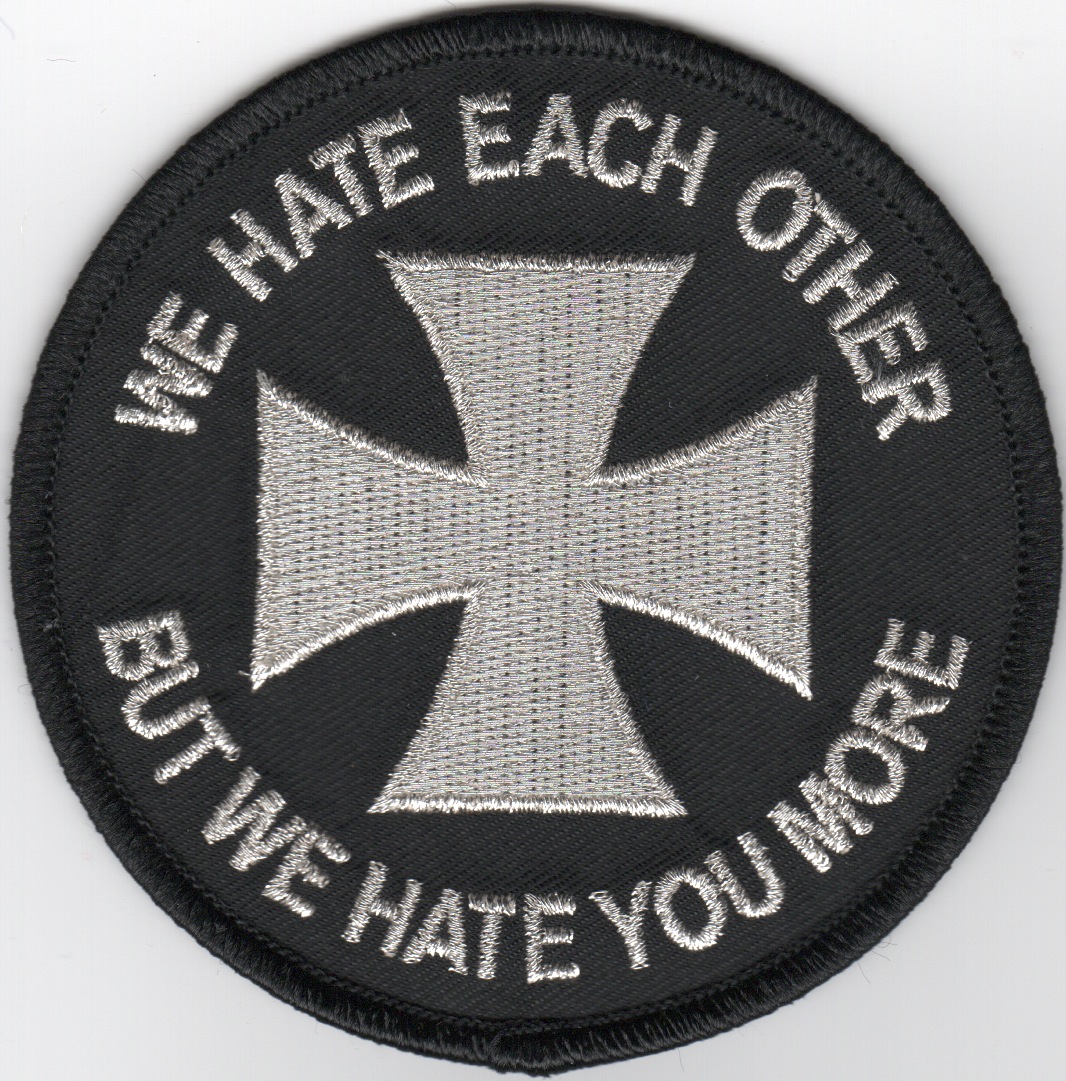 This patch was created for HMLA-169 and says “”””We Hate Each Other”””” (top) and “”””But We Hate You More”””” (bottom). It has the Maltese Cross in the center…..