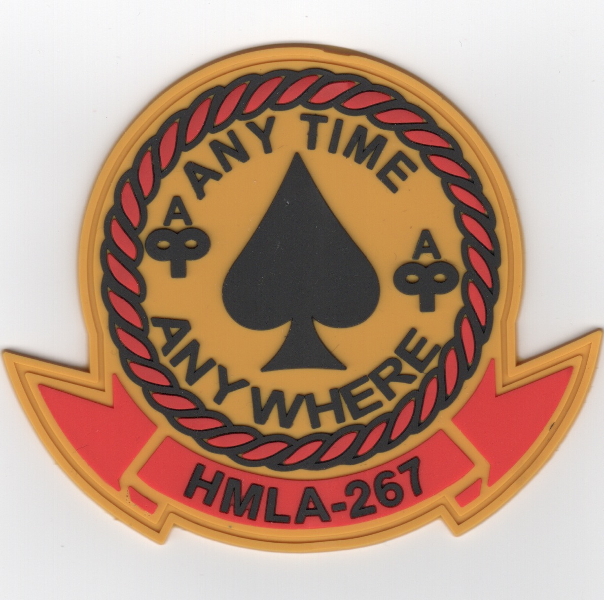 This is the PVC/RUBBER (yes, I said RUBBER) version of the squadron patch for HMLA-267. They are attached to MAG-39 located at MCAS Camp Pendleton. Their lineage dates from VMO-5, 15 February 1944 to 31 January 1946. They were reactivated 15 December 1966, redesignated HML-267, 15 March 1968, then again redesignated HMLA-267, 1 March 1987.