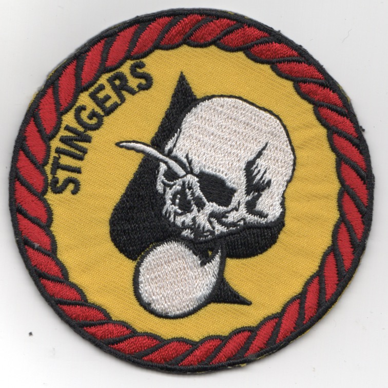 This is the yellow bullet patch for HMLA-267 ‘STINGERS’ that shows a skull on the Ace of Spades with a ‘Stinger’ going through the skull eye socket. Don’t know the meaning of this or the story behind it, any help would be greatly appreciated. This patch does not have velcro on the back.