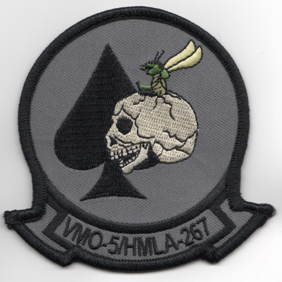 This is gray version of the HMLA-267/VMO-5 squadron patch that has a green ‘dragonfly'(?) sitting on a white skull on a black spade. This patch does not come with velcro attached.