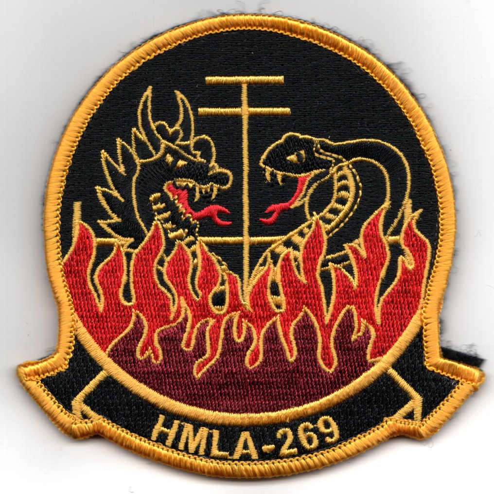 (Another AV8RSTUFF Creation): This is the ‘COBRA KAI’ version of the squadron patch. HMLA-269 is a United States Marine Corps helicopter squadron consisting of AH-1W SuperCobra attack helicopters and UH-1Y Venom utility helicopters. Also known as “The Gunrunners”, the squadron is based at MCAS New River, NC and falls under the command of Marine Aircraft Group 29 (MAG-29) and the 2nd Marine Aircraft Wing (2nd MAW). This patch DOES come with velcro attached.