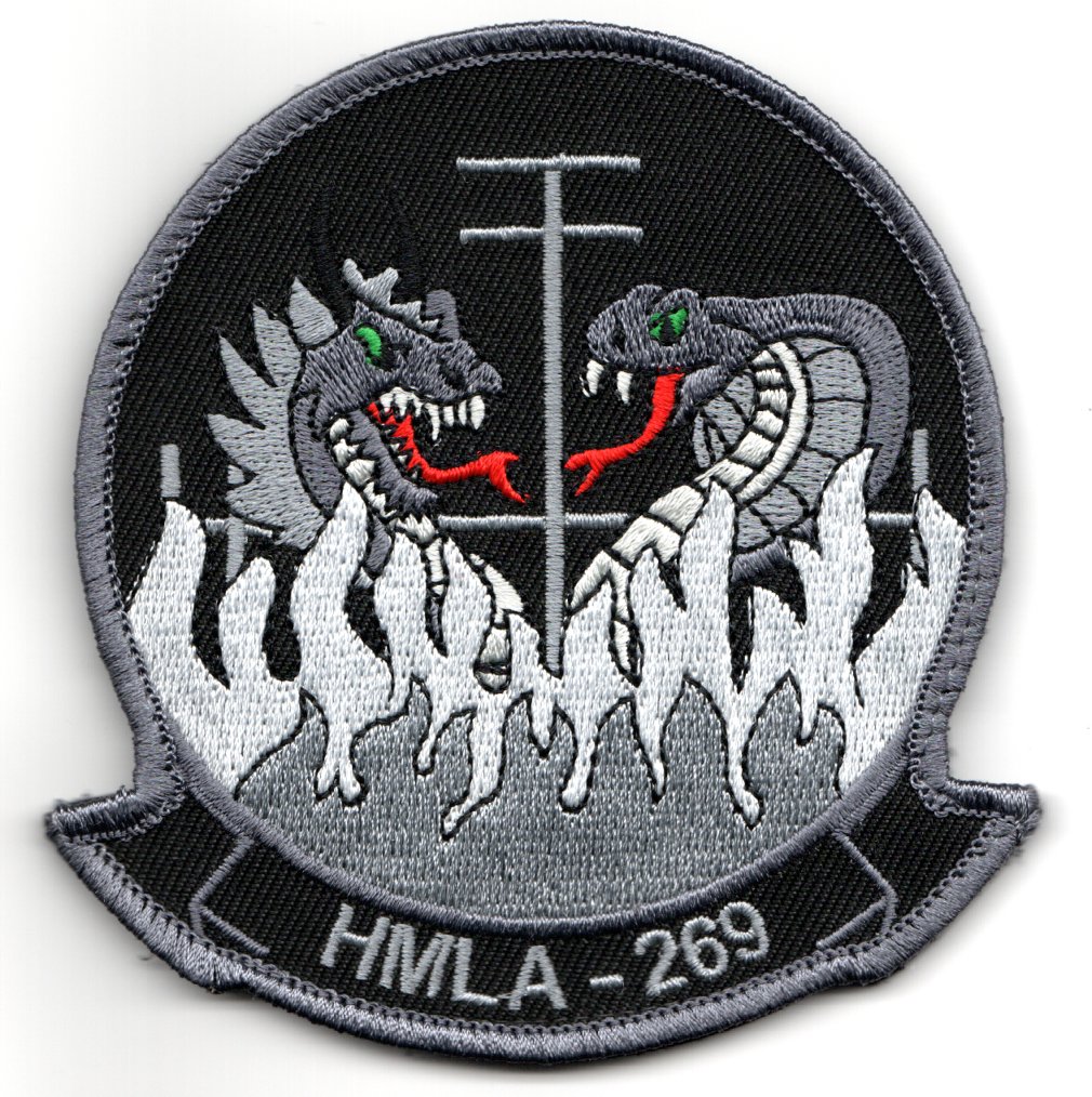 This is the black version (with GRAY letters and Mascots) of the squadron patch for HMLA-269. HMLA-269 is a USMC helicopter squadron consisting of AH-1W SuperCobra attack helicopters and UH-1Y Venom utility helicopters. Also known as “The Gunrunners”, the squadron is based at MCAS New River, NC and falls under the command of Marine Aircraft Group 29 (MAG-29) and the 2nd Marine Aircraft Wing (2nd MAW). This patch does not come with velcro attached.