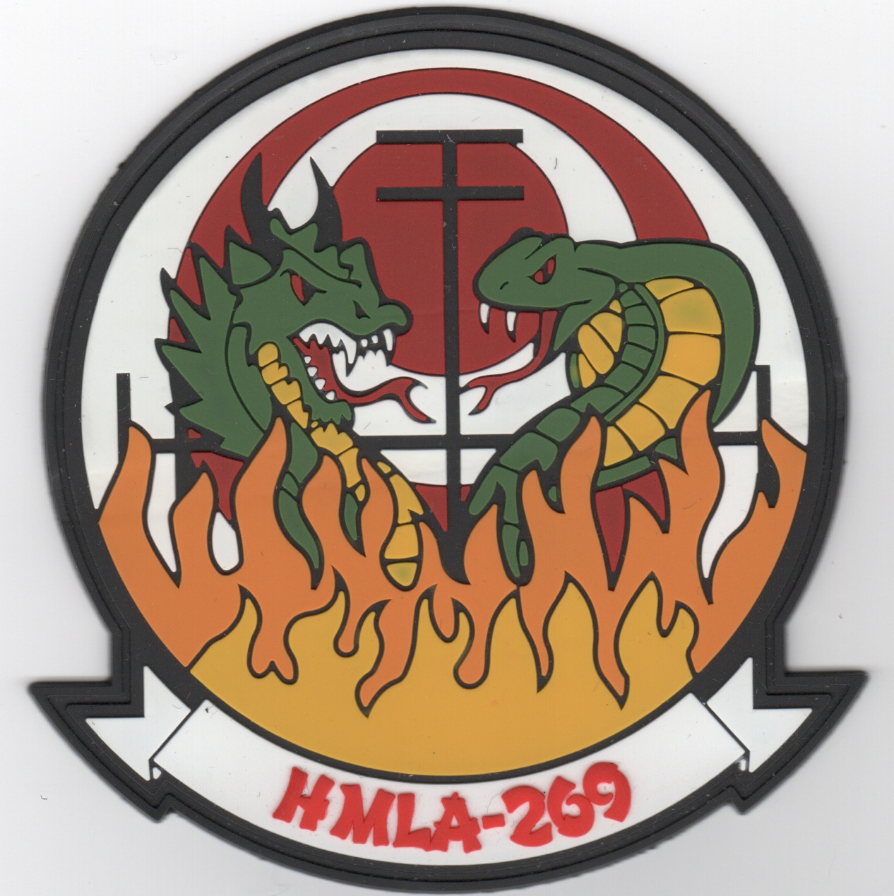 This is the color PVC version of the squadron patch for HMLA-269 that shows 2 “different” dragons facing each other. HMLA-269 is a United States Marine Corps helicopter squadron consisting of AH-1W SuperCobra attack helicopters and UH-1Y Venom utility helicopters. Also known as “The Gunrunners”, the squadron is based at Marine Corps Air Station New River, North Carolina and falls under the command of Marine Aircraft Group 29 (MAG-29) and the 2nd Marine Aircraft Wing (2nd MAW).