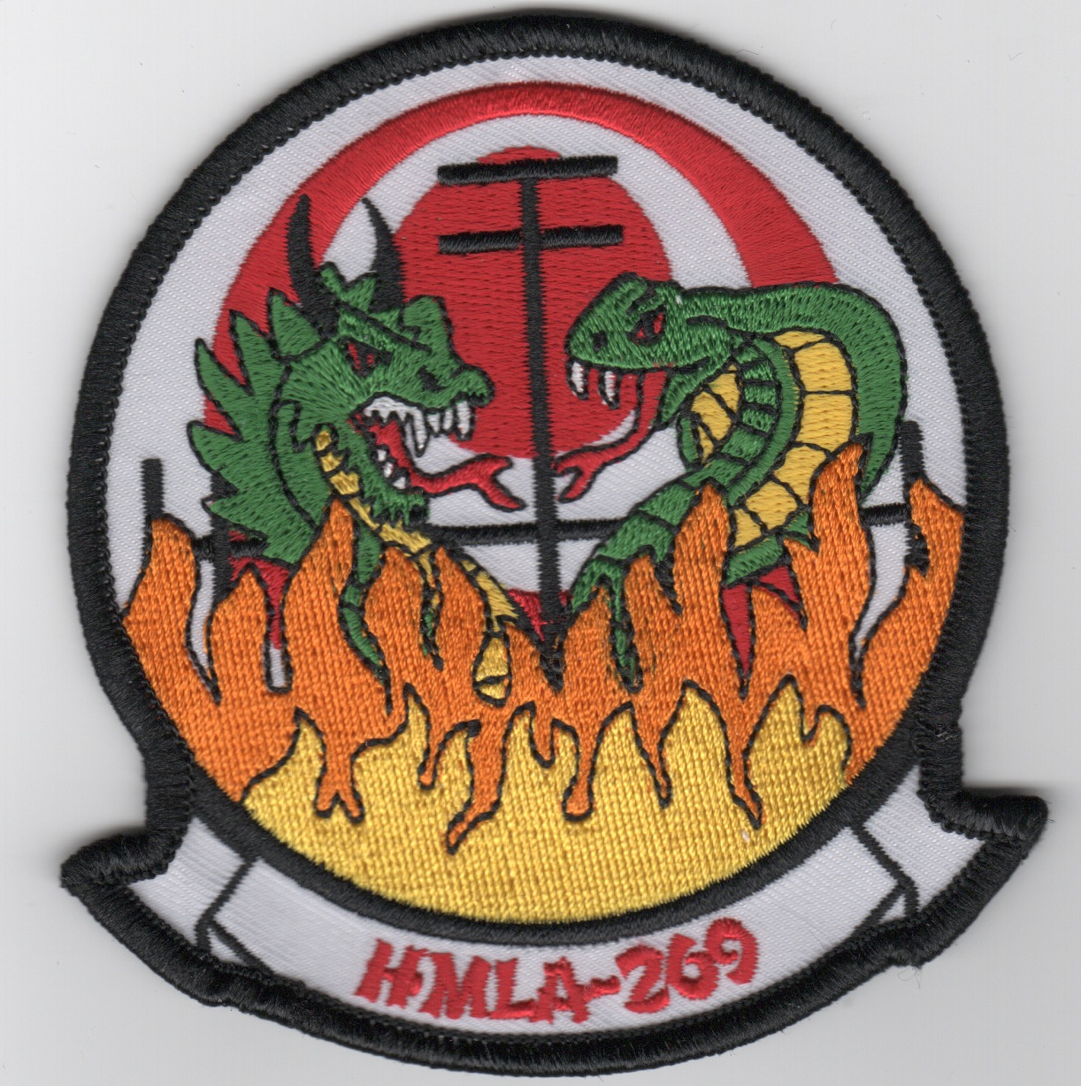This is the ‘white-background’ version of the squadron patch for HMLA-269 that shows 2 “different” dragons facing each other. HMLA-269 is a United States Marine Corps helicopter squadron consisting of AH-1W SuperCobra attack helicopters and UH-1Y Venom utility helicopters. Also known as “The Gunrunners”, the squadron is based at Marine Corps Air Station New River, North Carolina and falls under the command of Marine Aircraft Group 29 (MAG-29) and the 2nd Marine Aircraft Wing (2nd MAW). This patch does not come with velcro attached.