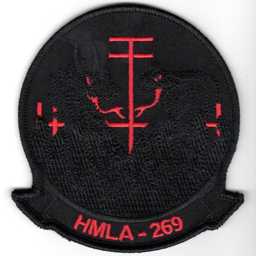 This is the black version (with RED lettering) of the squadron patch for HMLA-269. HMLA-269 is a United States Marine Corps helicopter squadron consisting of AH-1W SuperCobra attack helicopters and UH-1Y Venom utility helicopters. Also known as “The Gunrunners”, the squadron is based at Marine Corps Air Station New River, North Carolina and falls under the command of Marine Aircraft Group 29 (MAG-29) and the 2nd Marine Aircraft Wing (2nd MAW). This patch does not have velcro attached.